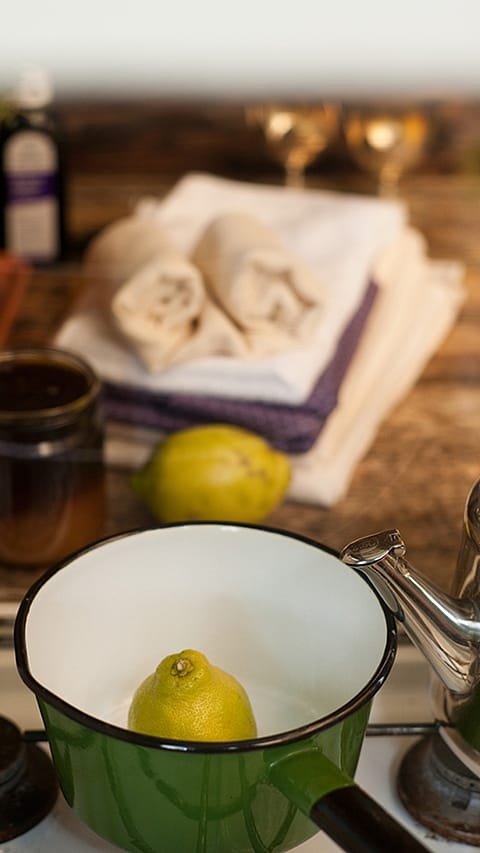 S bolestmi v krku se během podzimu a zimy setkáváme asi nejčastěji. Od nepříjemných pocitů si přitom můžeme jednoduše ulevit sami, a to zklidňujícím citronovým zábalem. Rozkrojenou půlku citronu vložte do misky a zalijte horkou vodou. Opatrně, abyste se neopařili, zmáčkněte pomocí vysoké sklenice vršek citronu, čímž uvolníte šťávu i obsažený esenciální olej. Následně vezměte kus bavlněné látky, která je dostatečně široká, aby zakryla celý krk a nedotýkala se páteře. Látku zatočte z obou stran směrem do středu a vložte do misky, aby absorbovala co nejvíce citronové vody. Vidličkou látku vyjměte z misky, přemístěte na suchý ručník a důkladně vyždímejte. Předtím, než zábal umístíte na krk, otestujte teplotu pomocí zápěstí. Krk zabalený látkou oviňte ještě teplým vlněným šálem a nechte působit po dobu 30 minut.