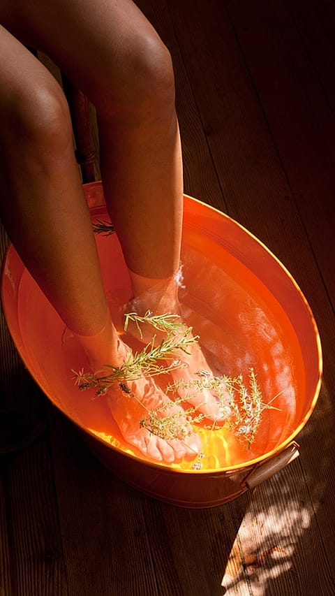 Každý z nás jistě zažil, jaké to je podcenit zimní obuv a vydat se v mrazivém počasí na dlouhou procházku. Studené nohy po návratu domů zažívají muka a nestačí je ani zabalit do teplých ponožek. Nejlepší proto je pořádně je napařit! V lavoru si nejprve připravte vodou o teplotě přibližně 33 ℃ a prochladlé nohy do ní namočte. Opatrně přidávejte další vodu a postupně zvyšujte teplotu. Vodu nelijte přímo na pokožku a dávejte pozor, aby teplota v lázni nepřesáhla 40 ℃ (nejlepší je použít teploměr). Příjemných pocitů si můžete užívat 10 až 15 minut, načež nohy vyndejte z vody, osušte ručníkem, oblékněte do teplých ponožek a na chvíli si odpočiňte. Lázeň není vhodná pro děti a osoby s problémy v oblasti nohou, které mohou být na horkou vodu obzvlášť citlivé.